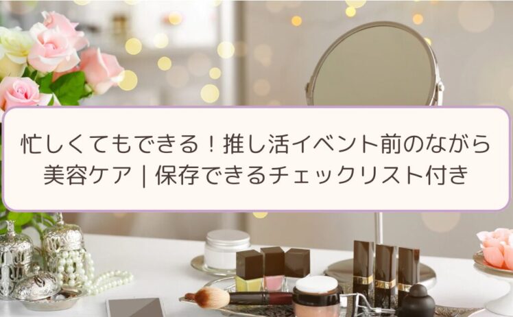 イベント準備・遠征 忙しくてもできる!推し活イベント前のながら美容ケア|保存できるチェックリスト付き 推し活イベント前に自宅でできるスキンケアやヘアケアを紹介。忙しい人もながら作業で取り入れやすい時短ケアをまとめました。保存できる便利なチェックリスト付きで、忘れ物なく最高の自分を整えて推しに会いに行きましょう。 2025.09.30 2025.10.09 イベント準備・遠征推し活